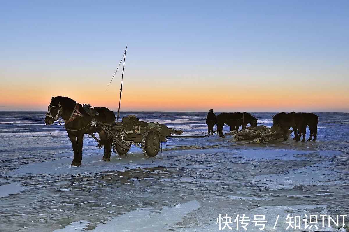 湖也祭好了,象征好运的头鱼也捕到了,那冬捕也就可以正式开始了。随着鱼老大一声“上冰”,所有冬捕人员,跳上拉网车或爬犁,分别乘坐三驾大马车,60多号人,浩浩荡荡开赴冰上作业。