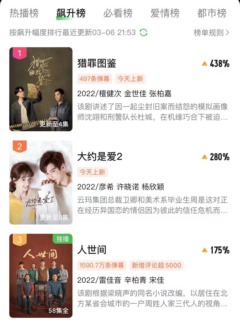 相比之下,刚刚上线的《猎罪图鉴》却是一部将传统探案剧融入到猎奇视角的悬疑剧作,目前这部剧作刚播4集就冲上飙升榜的第一位,言情剧以及爆款剧作《人世间》都不是这部新剧的对手。