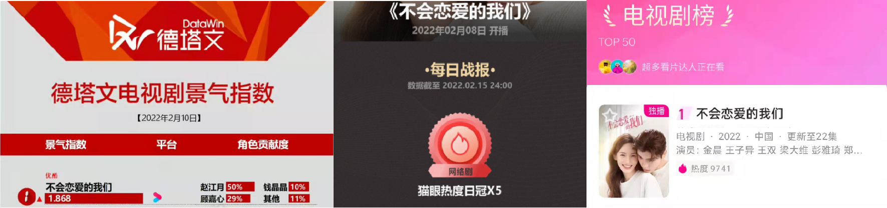 《不会恋爱的我们》聚焦当下年轻人的恋爱难题,通过剧中4对cp不同的恋爱模式,解读恋爱之道;在展现爱情甜蜜美好的同时,输出正向恋爱价值观,有趣且富有张力的剧情直接引发追剧热潮与话题讨论。截至收官,《不会恋爱的我们》全网热搜热榜总揽近200次,在抖音平台上,剧集短视频收获点赞2000w ,3支爆款视频点赞100w ,连续7天夺得剧集榜榜首,热度流量齐加码,数据大幅领先其他同期剧集,年初爆款剧实至名归。优酷站内热度突破9700,登陆德塔文、猫眼、Vlinkage榜等多个平台播放指数榜单高位,持续霸占微博剧集榜、电视剧话题榜等各类剧集榜单前位。