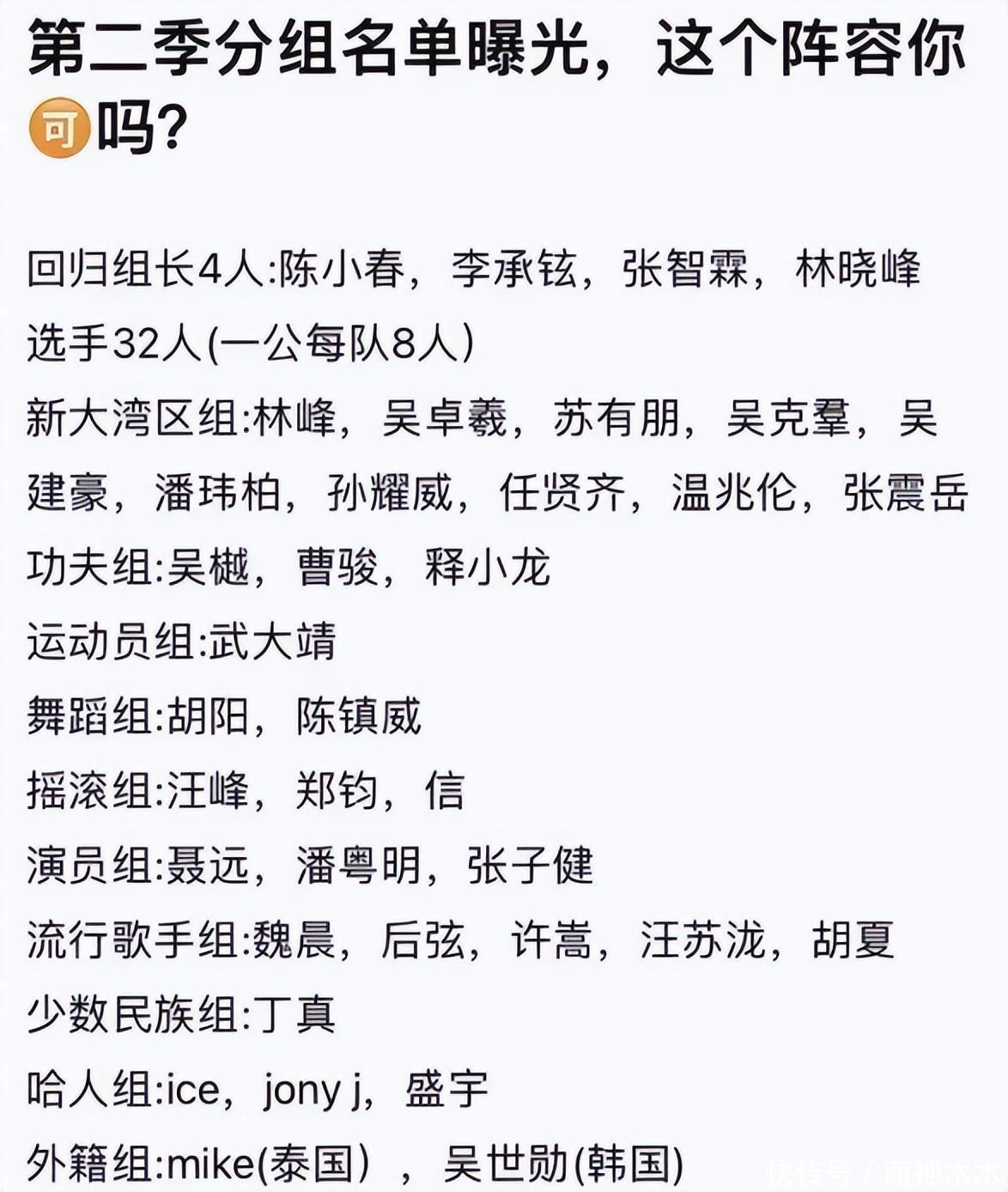 除了人选离谱,网友对于这份名单还有其他质疑,像运动员组的武大靖,之前参加《向往的生活》还提到还要继续坚持运动生涯,隔壁《乘风破浪》的徐梦桃都退赛了,那武大靖能参与《披荆斩棘》完整录制吗,不会也中途退赛吧?