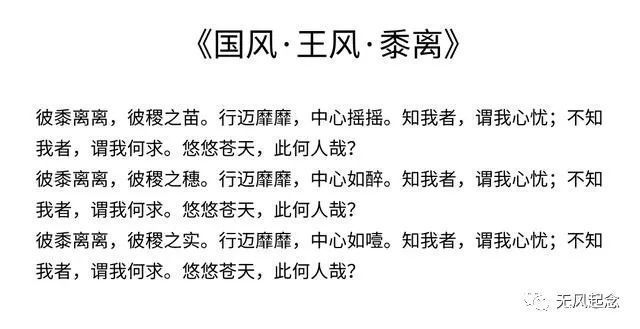 大家看看这段文字,共3个章节,每节39个字,节与节之间重章叠句,每节与前后两节仅有3个字不同。这首诗是一位周朝士大夫返回西周旧都,昔日繁华不见,只留下一片萧条,便写下了这首诗表达忧愁。
