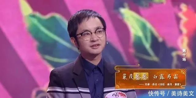 这三句诗都出自《诗经》,亚轩的第一首出自《诗经》的第一首诗,名为《关雎》。彭敏受到了亚轩启发,才想起了《蒹葭》中的“蒹葭苍苍”,而坤健更机智,直接用了《蒹葭》中的后一句“蒹葭萋萋”。这两首诗大家应该都是很熟悉的,都是《诗经》中最经典的爱情诗之一。喜欢玩叠字飞花令的朋友,这三位选手其实已经告诉你们如何玩了,只要多背几首《诗经》中的作品就够了,因为叠字玩得最牛的就是《诗经》。