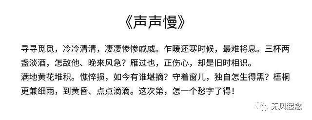 李清照这首词有多有名不用笔者多说,它最牛的就是开篇的14个叠字,因为这14个字这首词就像打上了防伪标签一样,让人无从模仿,无法超越。李清照当年身负亡国之恨、丧夫之苦,所以提笔时感情便劈空而来,才能写下如此你经典的14叠字。
