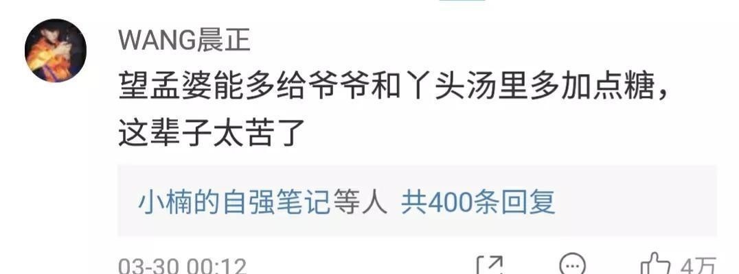 他说:“望孟婆能多给爷爷和丫头汤里多加点糖,这辈子太苦了。”