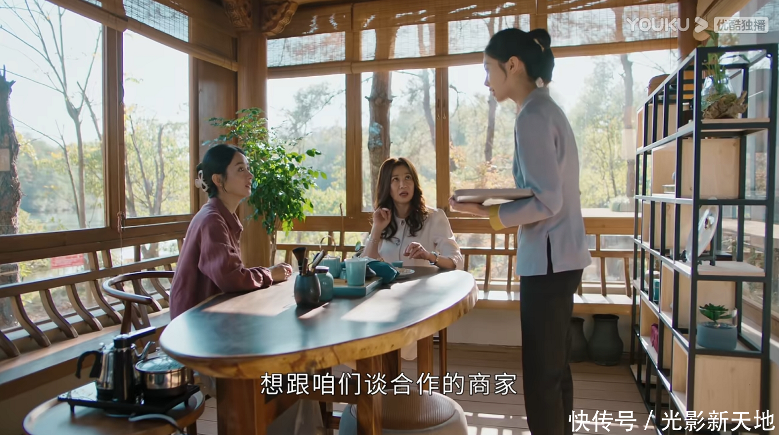 话还没说完,来了服务员送上果盘和干果,然后说要来一个谈合作的商家,直接把亚妮妈妈看傻眼了。这一段特别值得揣摩。正常来说,对于这样一家客栈,谈合作的商家肯定是直接和幸福沟通了,为什么要通过一个端茶倒水的服务员?又不是秘书,只能说这一段是幸福提前安排好的,目的就是为了彰显自己的实力,不会被人小看。