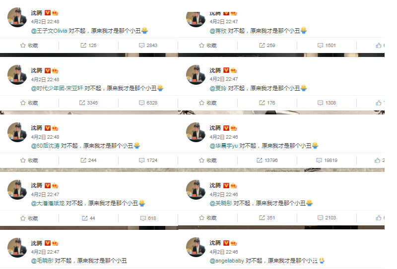 5月2日晚沈腾在自己的微博里连发了十条道歉微博,并@了十位当晚《王牌对王牌》里的嘉宾和主持人。