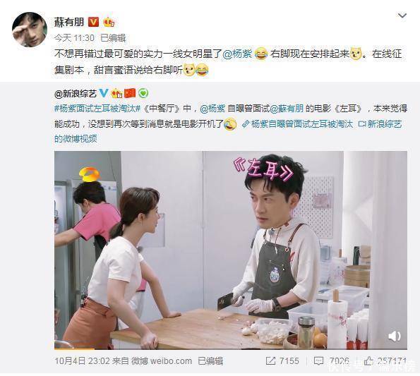 节目中,几个人正在准备饭菜,杨紫突然记起自己试戏的事情,她便询问苏有朋还记不记得自己试过他的戏,看到苏有朋一脸懵,杨紫开始滔滔不绝地讲起了自己的“伤心往事”。