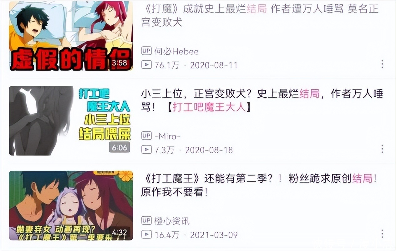 然而《打工吧!魔王大人》轻小说的作者不知道后期犯了什么病,竟然对女二小千狂喜不已,反倒忽视了女一勇者,后面几话女二小千鸠占鹊巢,基本上抢了女一的位置,并且在大结局和勇者成为一对。一直追原著小说的小伙伴可能会接受小千上位,但大部分的粉丝都只看过动画第一季,那时候女一还是勇者,因此他们知道女二上位的结局之后坚决不接受。