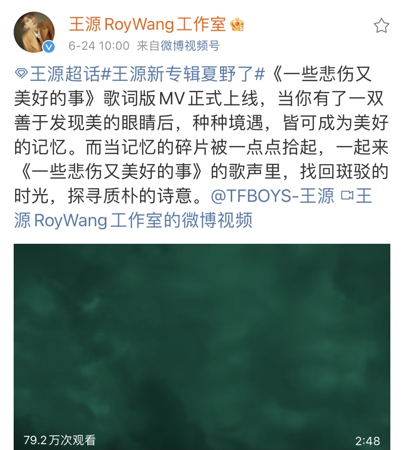 6月24日,王源新专辑《夏野了》“Whisper”篇歌曲《一些悲伤又美好的事》歌词版MV正式发布。