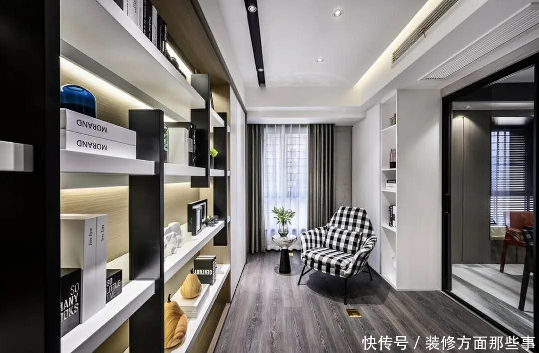 书房定制一排带有藏灯带的书柜.加上一张黑白格纹的休闲沙发椅.使得书房空间充满舒适的轻松氛围感