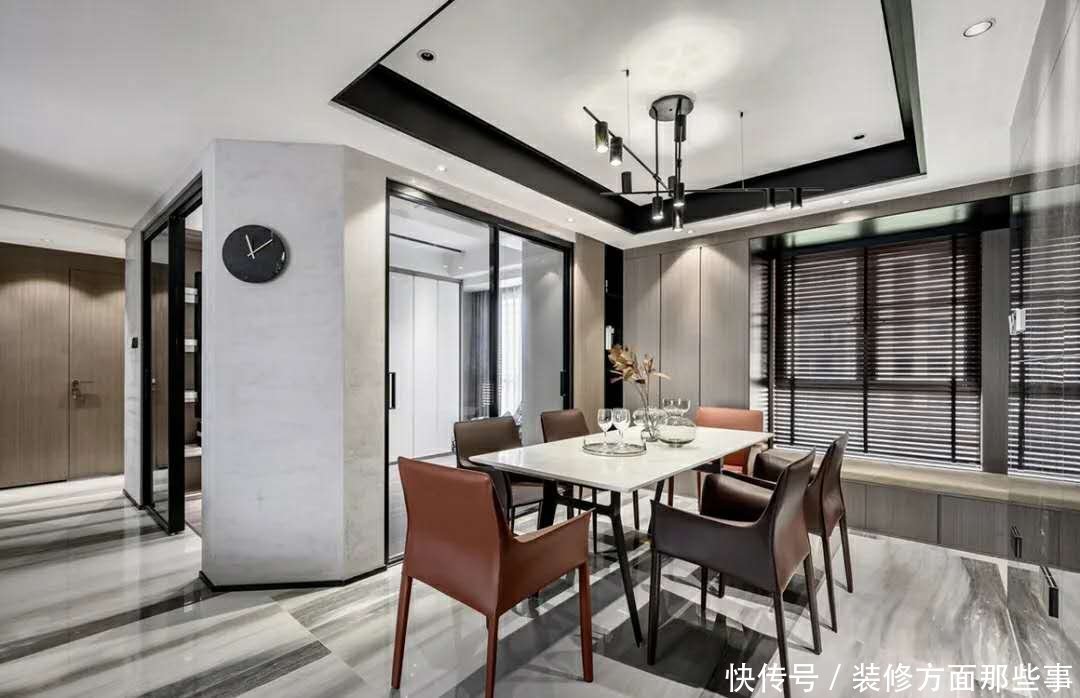 餐厅现代优雅的空间基础.吊顶加上黑色的边框元素.还有轻奢的大理石台面餐桌和皮质的餐椅.让整体空间舒适又大气