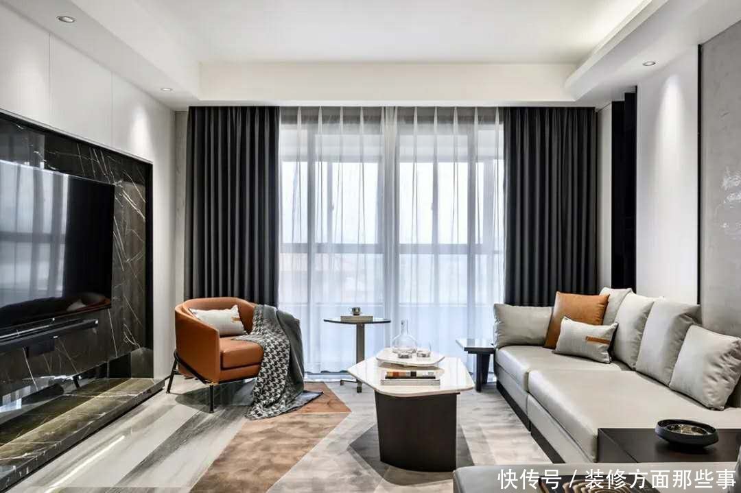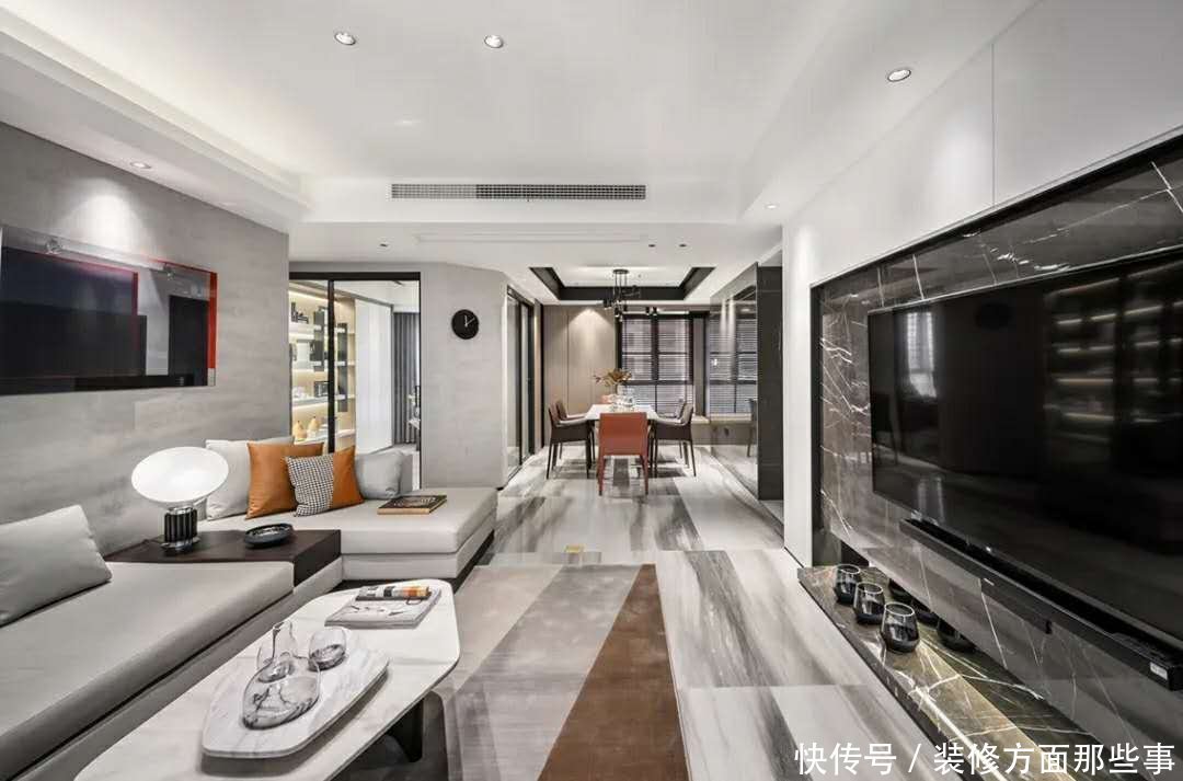 客厅电视墙以灰色大理石材质的设计.还装上一个灰色大理石地台.搭配轻奢的家具点缀.也让空间显得更加时尚舒适