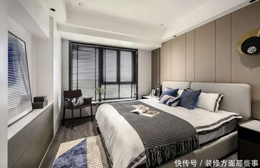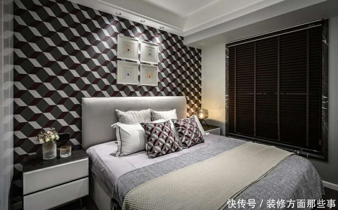 次卧作为长辈房间.床头背景墙以黑色的立体几何图案的墙布.深色稳重.加上轻奢的皮质床.打造出一种稳重舒适的睡眠氛围