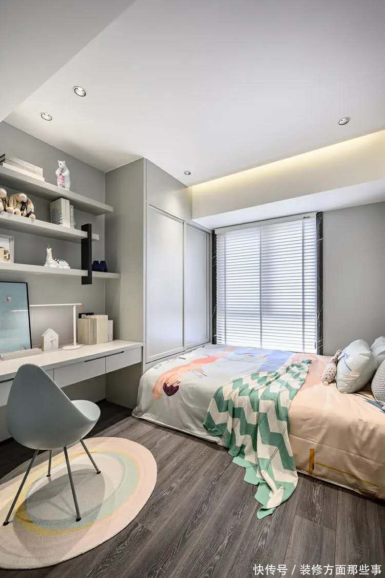 儿童房采用定制的一体榻榻米和衣柜.还有书桌组合.让空间不大的房间舒适而不拥挤