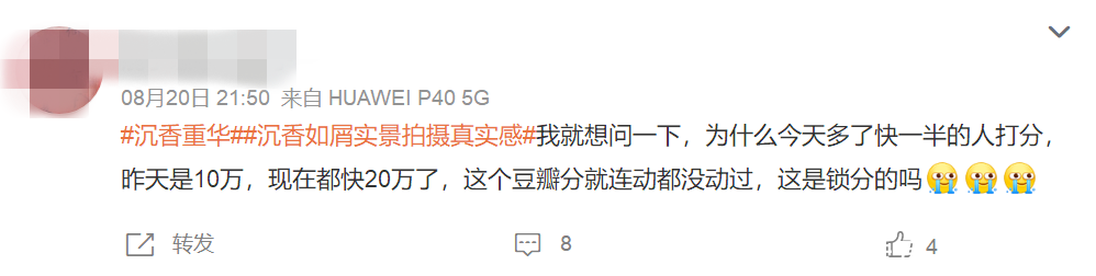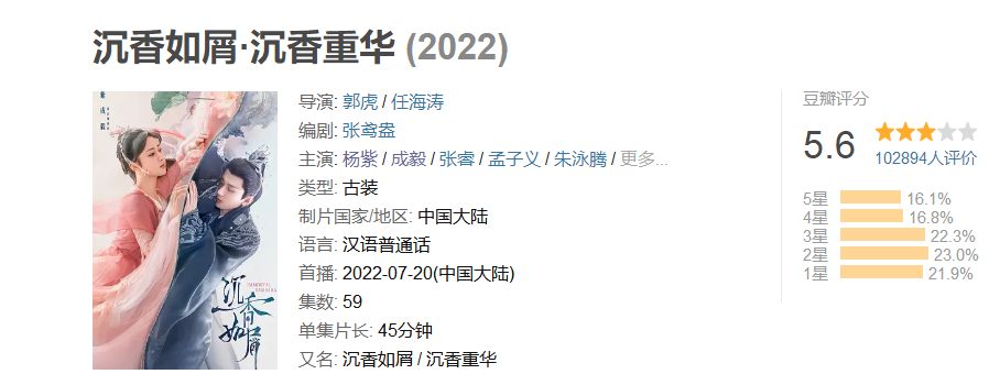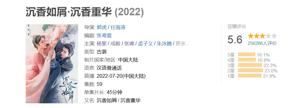 但是让人有些意外的是在8月20日,《沉香如屑》的豆瓣评分出炉,而数据如此亮眼的作品最后开出的评分却只有5.6分,甚至没有6分,不到及格线。