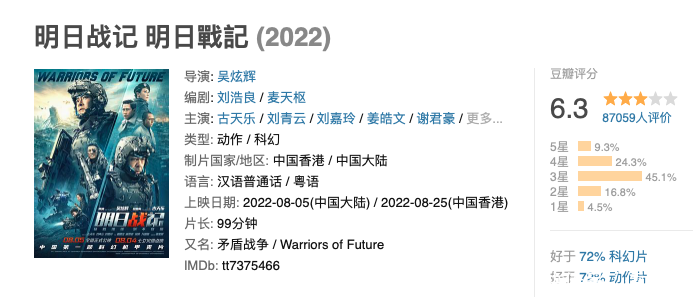 当然,这并不是《明日战记》票房低迷的主要原因,《明日战记》扑票最大的原因还是该片的故事太过单薄。从剧情来说,其实《明日战记》依然是用科幻的外壳包裹了一个警匪题材,在内容的推进上显得无力,还有许多无关紧要的煽情部分,或许这也是影响观众们二刷、三刷的重要原因。